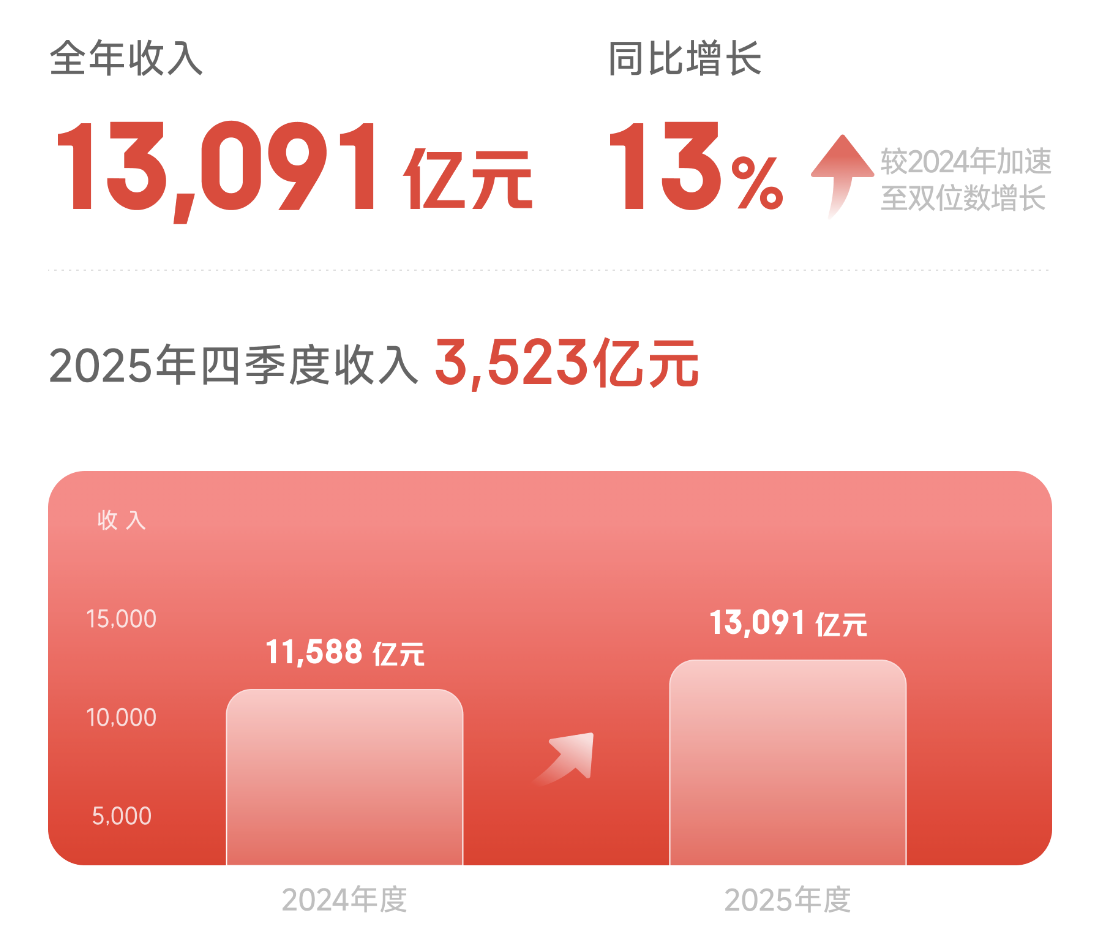 3月5日,京东发布2025年全年及四季度业绩:全年收入13091亿元,同比增长13%,年度活跃用户突破7亿。在这份财报里,"中国第一大品牌电商平台"的地位已经完全做实,消费电子和日百品类守住的那条品质护城河,要延伸到更多场景里去了。