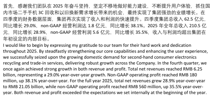 从爱回收2025年第四季度的数据中可以看出,其在2025年的营收是同比增长了28.9%的。