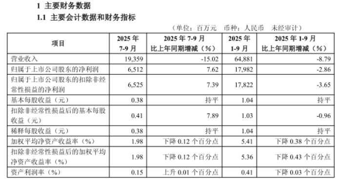 第三季度的单季营收虽同比下降15.02%,但环比已出现企稳迹象,说明内部管理与成本控制初见成效(前三季度成本收入比同比下降0.21个百分点)。