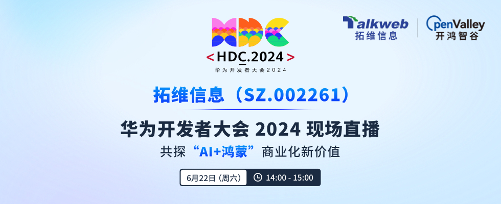 华为开发者大会2024(HDC 2024)将于6月21日-23日举办,拓维信息作为华为“鲲鹏/昇腾AI+行业大模型/云+开源鸿蒙”全方位合作伙伴,将携手旗下开鸿智谷,深度解读公司“AI+鸿蒙”战略,展示智慧考试、智慧交通、智慧城市、智慧教育等行业的“AI+鸿蒙”创新产品、应用场景和商业化成果,与您一起共探、共享“AI+鸿蒙”万亿新蓝海!