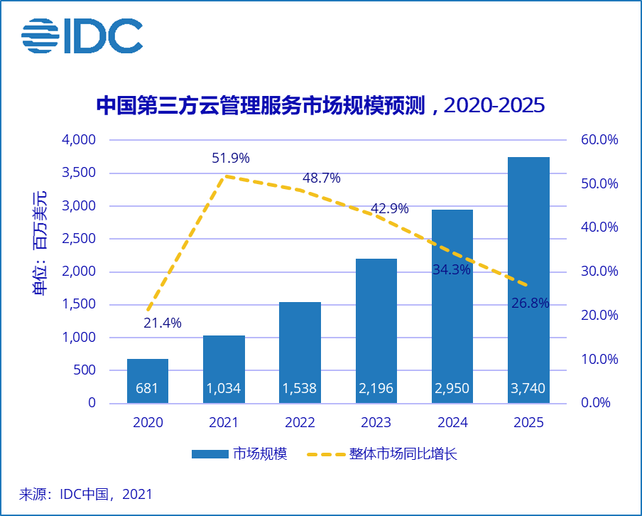 IDC报告指出,2020年第三方云管理服务市场规模为6.8亿美元,增速降至21.4%,对比2019年增速下降了61.2%。