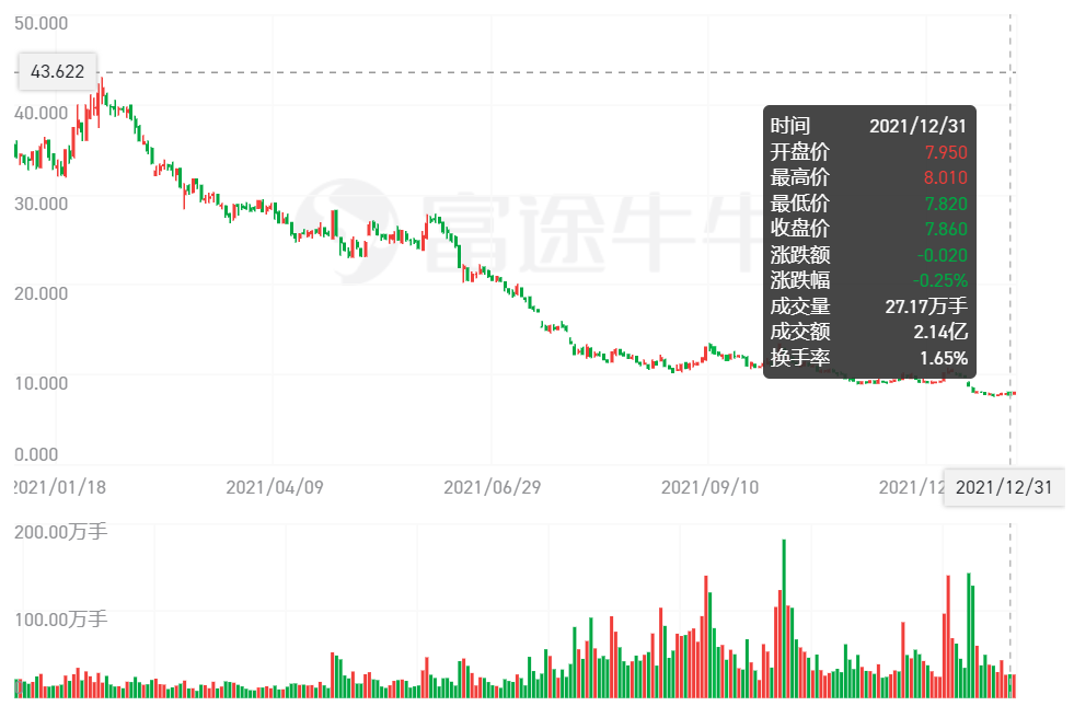 在2021年2月2日,中公教育的股价还一度达到43元,总市值超过2600亿元,然而截至2021年12月31日,收盘价仅为7.86元,下跌超过80%。2021年的中公教育,让不少股民跟着心碎了。