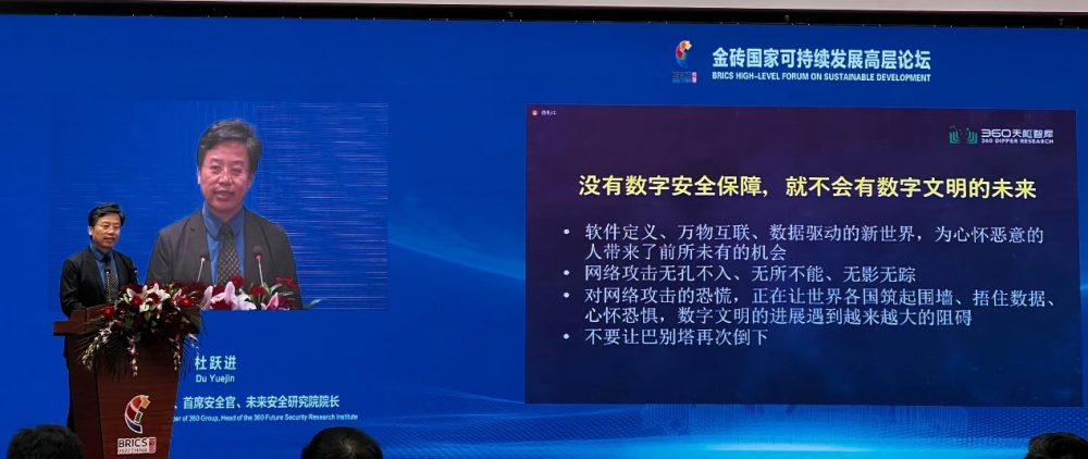 DoNews7月1日消息(郭睿琦)6月29日,金砖国家可持续发展高层论坛在福州市召开,三六零副总裁、首席安全官、未来安全研究院院长杜跃进受邀参会并发表了题为“用数字安全确保数字繁荣”的演讲,分享了中国数字安全技术与解决方案。