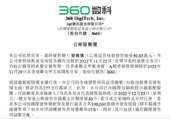 DoNews11月23日消息,360数科在港交所发布公告称,最终发售价已确定为每股发售股份50.03港元。待香港联交所批准后,A类普通股预期将于2022年11月29日在香港联交所主板开始交易,股份代号为“3660”。假设超额配股权未获行使,公司的全球发售所得款项总额(扣除包销费及发售开支前)预计约为2.772亿港元。