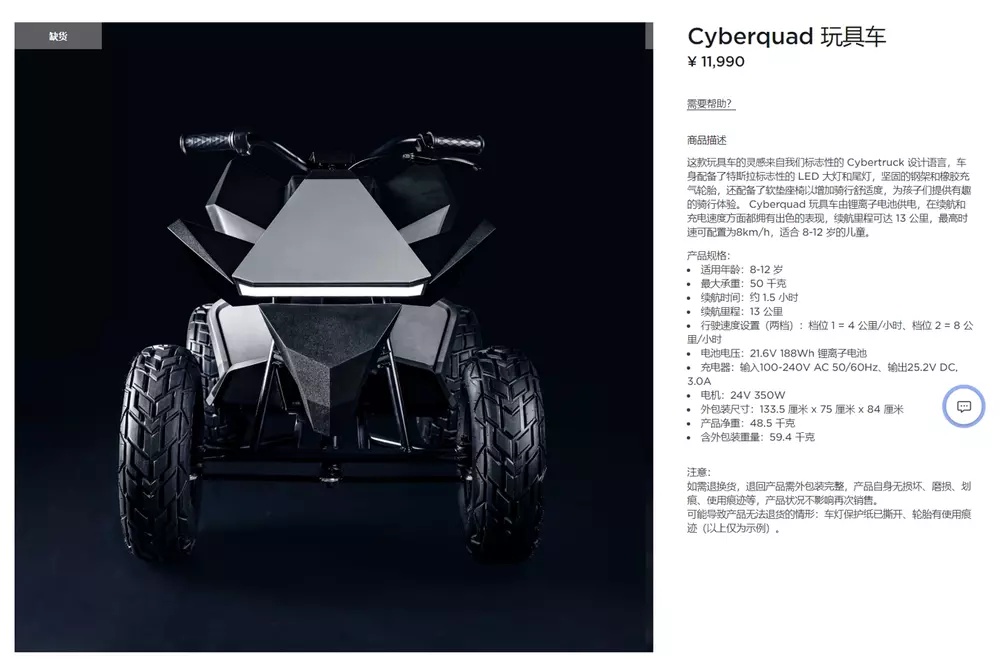 特斯拉 Cyberquad 玩具车售价 11990 元,适用于 8-12 岁的儿童,续航里程可达 13 公里,最高时速可配置为 8km/h。