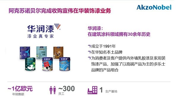 相关收购业务年销售额预计约1亿欧元,并拥有相关员工约300名,并包括宣伟旗下知名装饰漆品牌华润漆。该品牌已深耕本地市场多年并广获认可。该收购意向已于2023年4月首次宣布。