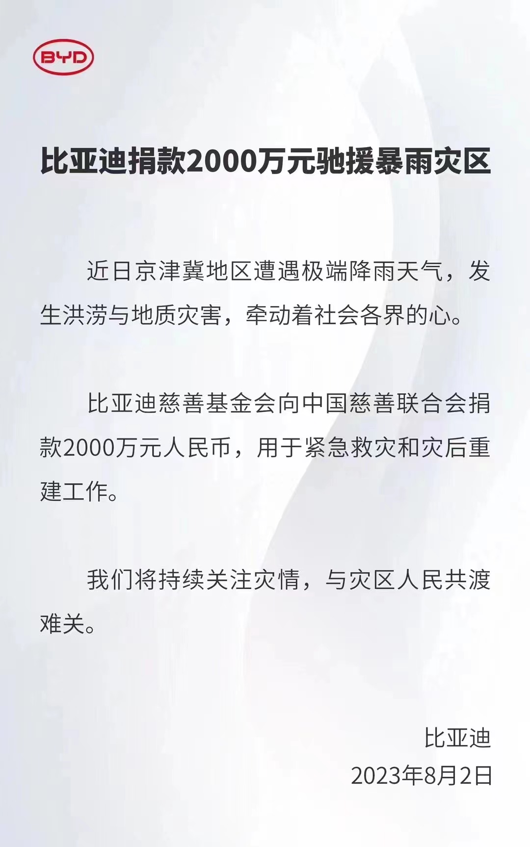 比亚迪宣布捐款2000万元驰援暴雨灾区