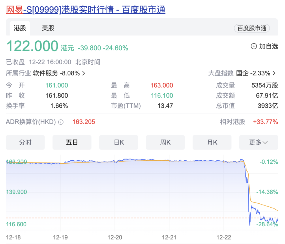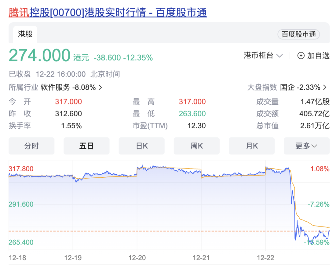 其中,腾讯、网易两家游戏头部大厂受影响十分明显,截至12月22日收盘,网易跌24.6%,为上市以来最大单日跌幅,一天几乎跌去了一年的涨幅,市值蒸发1283亿港元;腾讯跌12.35%,市值一天蒸发3670亿港元(相当于跌掉了一个小米),据悉,港股市场目前仅23只股票的市值超过3670亿港元。