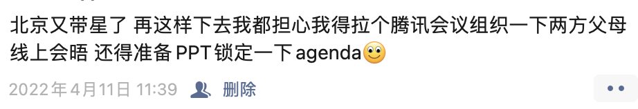 疫情的时候,我和老金被困在北京,但本来双方家长约好五一假期见面。情急之下,我俩差点组织一场线上会议,来促成双方家长的首次会晤。最后还好,只是拉了个群「提前拉齐了一下需求」。