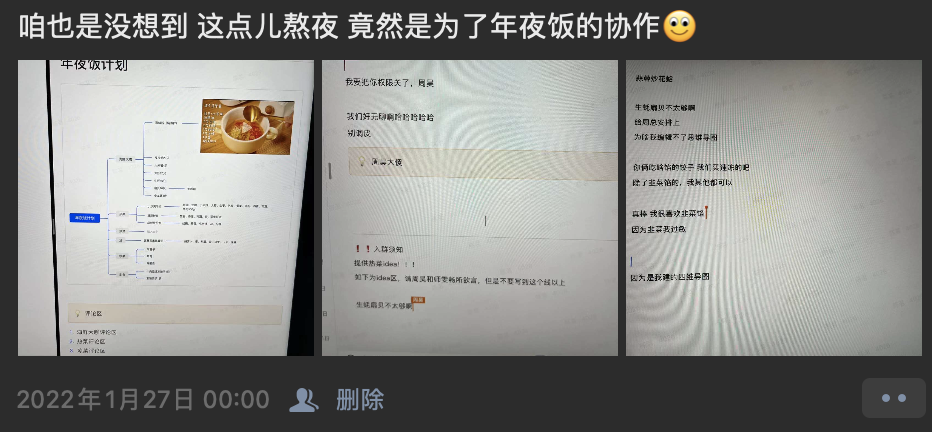 2022年的春节,我们和朋友相约跨年。晚上十一点半,大家在商量年夜饭菜单。微信沟通太过碎片化,老金开了一个云文档在线协作。从菜品准备到人员分工,从忌口事项到文本规则,半小时就理出了个大概。