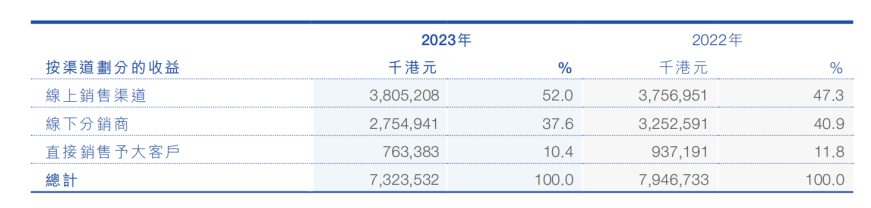 财报显示,就渠道而言,2023年除线上渠道小幅增长外,其他两大渠道出现不同程度的下跌。详细来看,2023年,公司线上销售渠道实现营收为38.05亿港元,同比增长1.3%;线下分销商实现营收为27.55亿港元,同比下降15.3%,其主因疫情后经销商降低库存水平;直接销售予大客户实现营收为7.63亿,同比下降18.5%,已倒退至2019年水平。