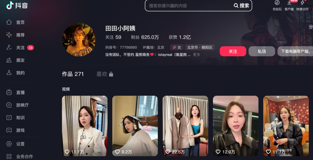 田田小阿姨在抖音有625万粉丝,此前经常与王红权星互动。