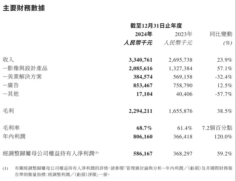 美图公司表示,总收入与净利润的增长主要得益于 AI 技术高度融入影像与设计产品,持续提升功能效果,带动高毛利的付费订阅收入快速攀升。作为美图公司最大收入来源,影像与设计产品业务全年收入 20.9 亿元,同比增长 57.1%,占总收入的 62.4%。
