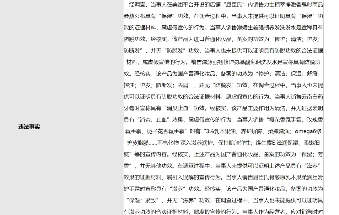 聚焦此次北京屈臣氏被罚的案例来看,其在美团平台开设的店铺上,销售的力士植萃净澈香皂,商品参数公布具有“保湿”功效,但并未提供相关证明材料。