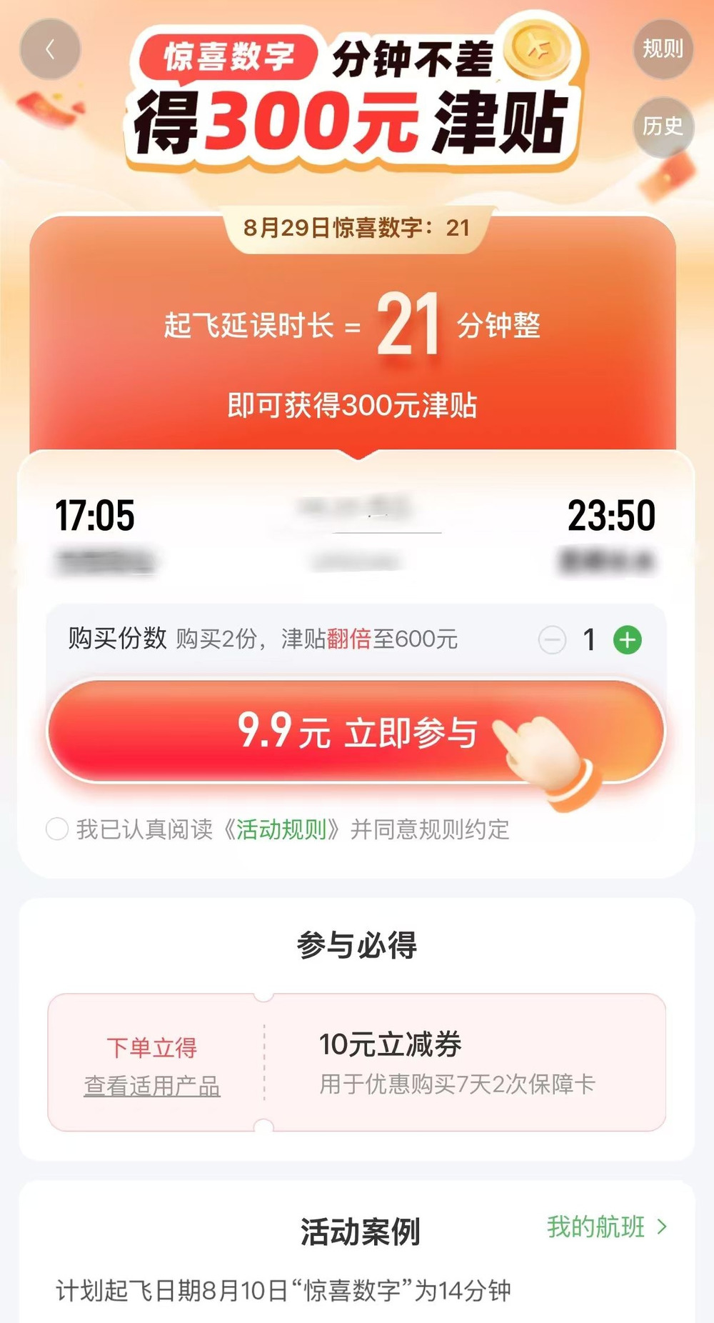 随后,记者以9.9元投保,记者获得是8月30日的惊喜数字15。投保页面设计色彩鲜艳,写着“惊喜数字,分钟不差,得300元津贴”“起飞延误时长=15分钟整,即可获得300元津贴”。