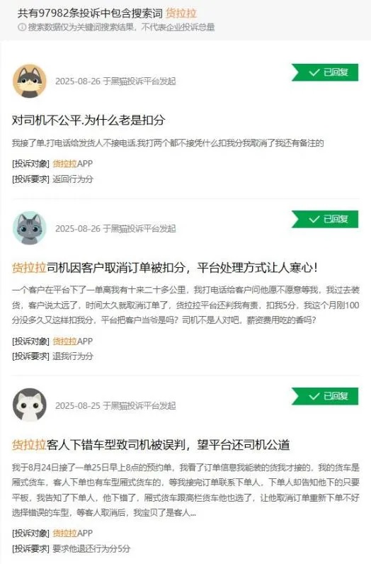 在黑猫投诉平台上,与货拉拉相关的投诉超过9万条,矛头直指“恶意压价”“无故扣分”“抽佣比例畸高”等问题。可见,这种双重收费模式本质上是一种“杀鸡取卵”的短期行为,当司机收入被过度挤压,平台的生态健康必然受损。