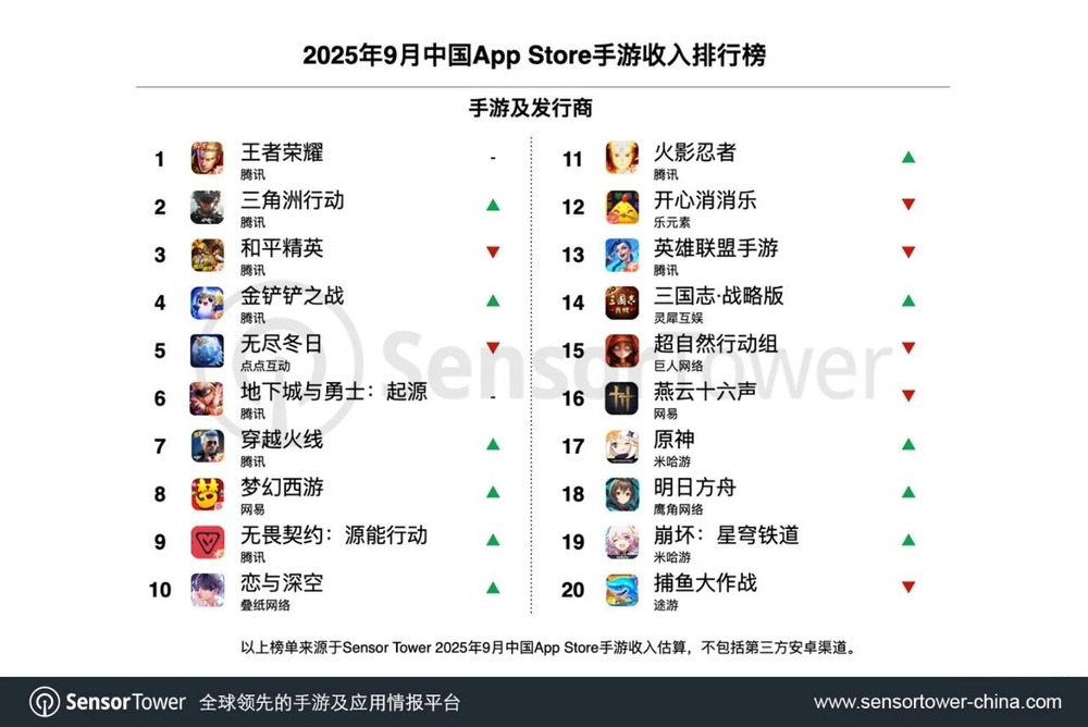 得益于赛季热度带动,《三角洲行动》9月收入环比大涨76%,加之《王者荣耀》与《和平精英》等头部游戏的出色表现,腾讯稳居中国手游发行商收入榜之首。