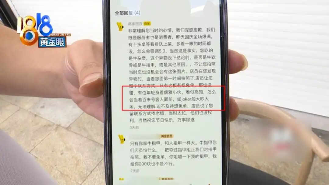 这位抖音网友并非唯一一位国庆假期期间在许府牛遇到糟心事的顾客。据1818黄金眼栏目报道,家住杭州的郑先生两口子和一位同伴于10月2日去杭州西湖区奥莱金街的许府牛火锅店用餐,点了157元的牛杂煲三人套餐。郑先生的妻子在菜里面吃到了一个类似“指甲盖”的物体,里面还有很多那种黑色的污渍。