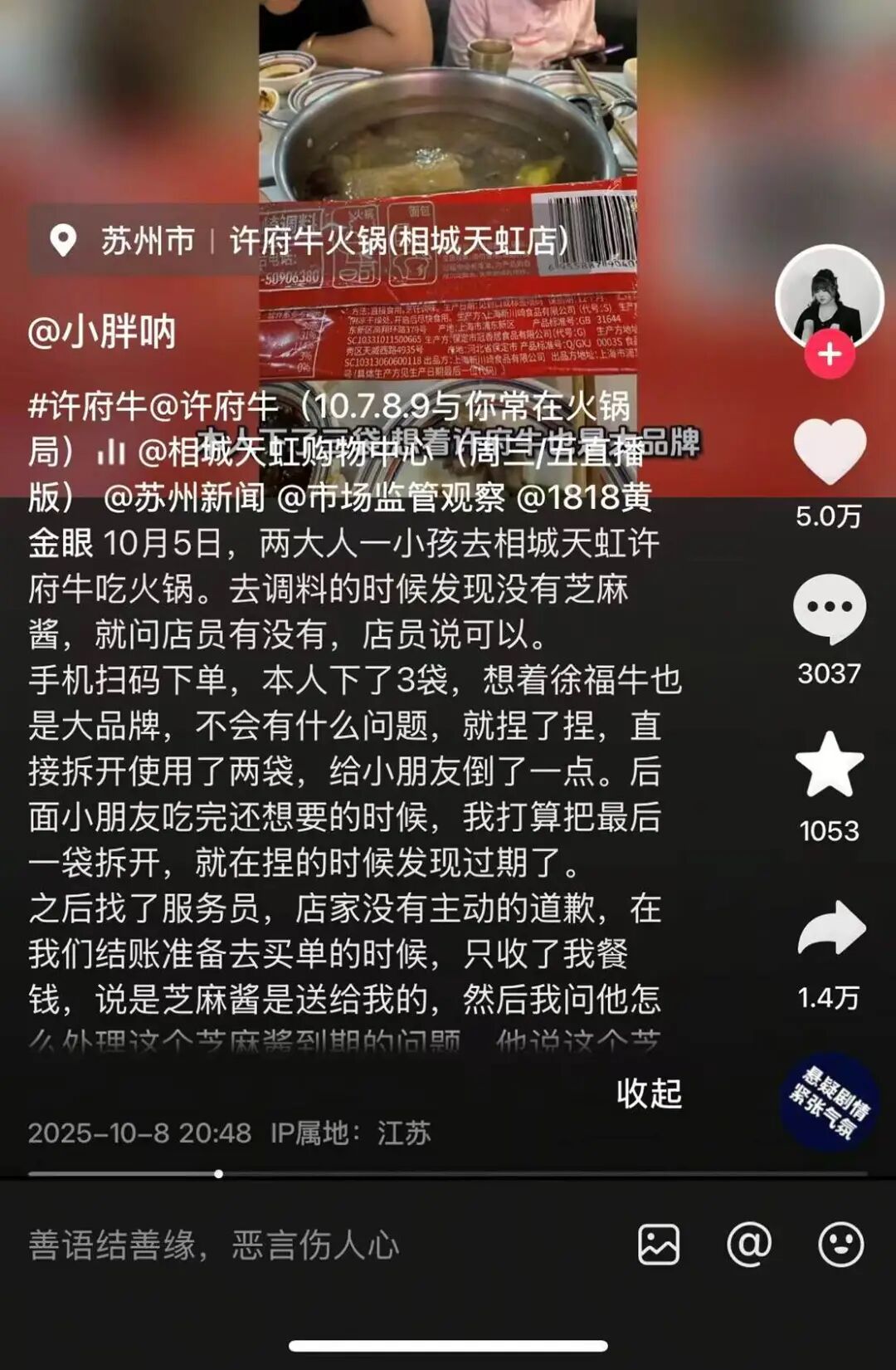 DoNews10月11日消息,据瑞财经报道,10月9日,有网友在抖音上发视频称,自己10月5日带着孩子在苏州相城天虹许府牛火锅用餐时,发现所点芝麻酱是过期的,向店员提出后,却被回复称吃一下没事的。