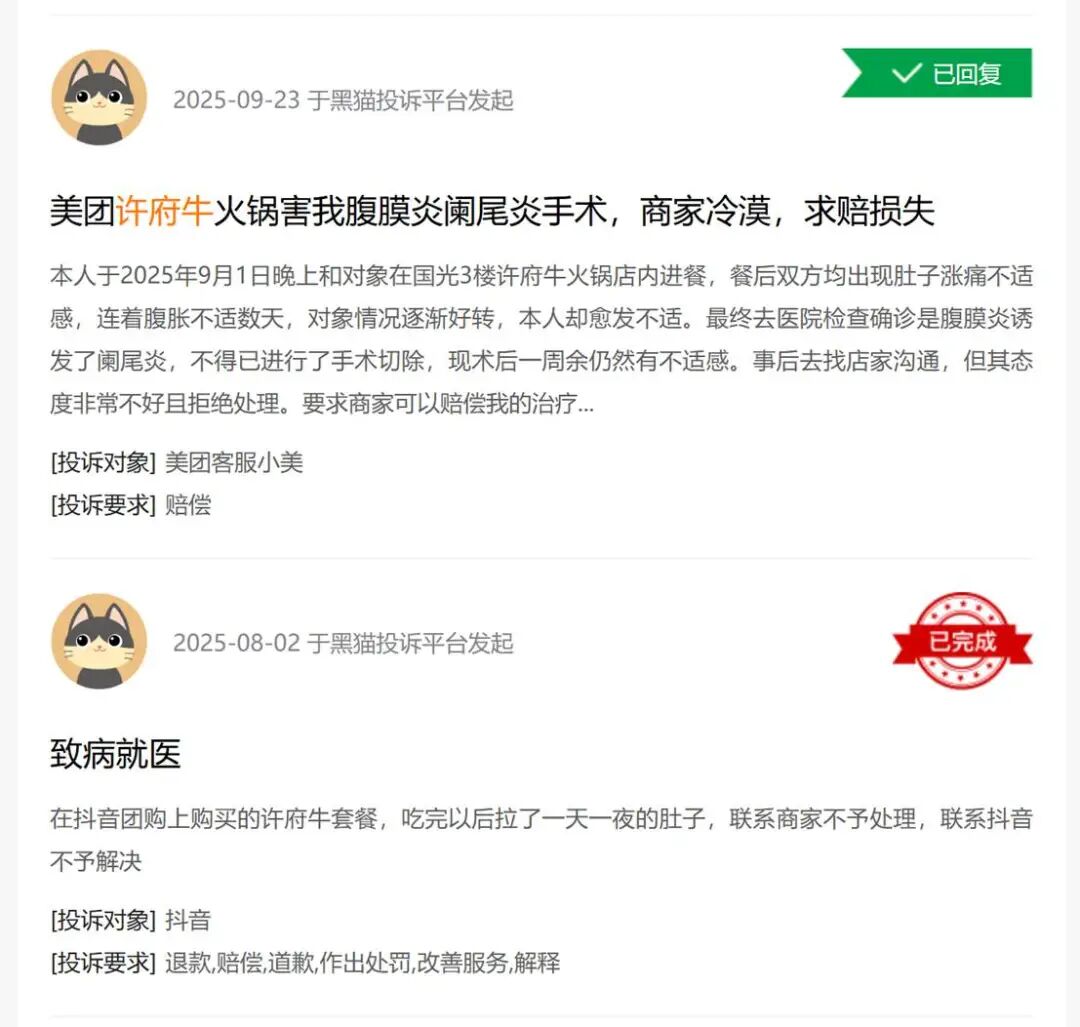 黑猫投诉平台上,也有不少消费者表示许府牛菜品不新鲜,有异物,用餐后出现身体不适,症状包括拉肚子、肚子涨痛不适等。