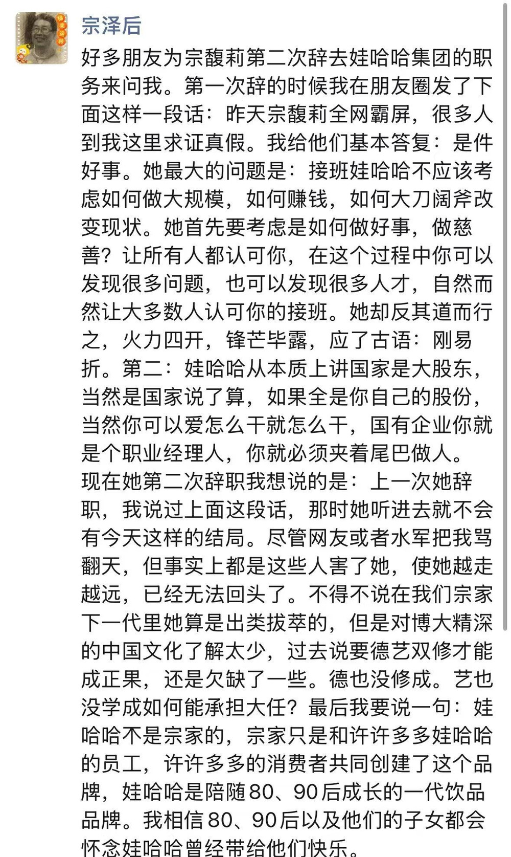 不得不说在我们宗家下一代里她算是出类拔萃的,但是对博大精深的中国文化了解太少,过去说要德艺双修才能成正果,还是欠缺了一些。德也没修成。艺也没学成如何能承担大任?最后我要说一句:娃哈哈不是宗家的,宗家只是和许许多多娃哈哈的员工,许许多多的消费者共同创建了这个品牌,娃哈哈是伴随80、90后成长的一代饮品品牌。我相信80、90后以及他们的子女都会怀念娃哈哈曾经带给他们快乐。”