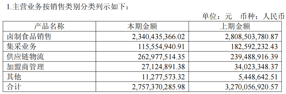 2025年上半年,绝味食品的营收为28.20亿元,同比下降15.57%;归母净利润为1.75亿元,同比下降40.71%。其中,绝味食品的主营业务卤制食品销售业务同比下降16.67%至23.40亿元,是导致营收大幅下滑的直接原因。