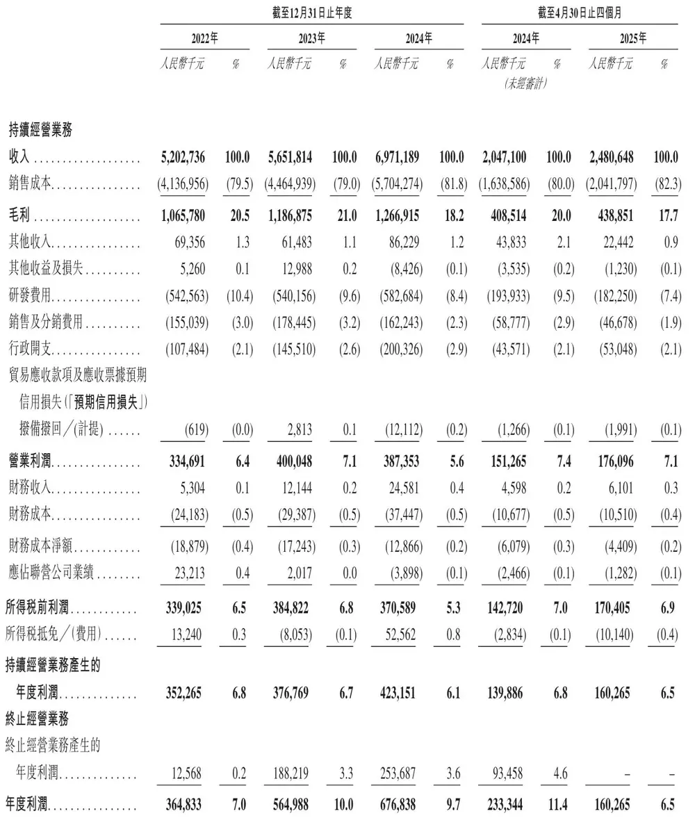 招股书显示,广和通2022年、2023年、2024年营收分别为52亿元、56.52亿元、69.71亿元;毛利分别为10.66亿、11.87亿元、12.67亿元;毛利率分别为20.5%、21%、18.2%。