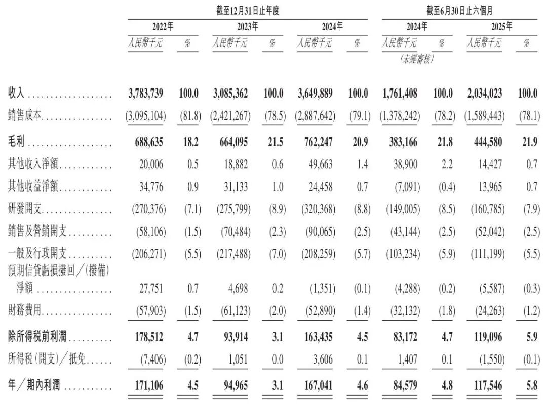 剑桥科技2022年、2023年、2024年年内利润分别为1.71亿元、9497万元、1.67亿元;年内利润率分别为4.5%、3.1%、4.6%。剑桥科技2025年上半年营收为20.34亿元,毛利为4.45亿元,毛利率为21.9%;期内利润为1.18亿元,期内利润率为5.8%。