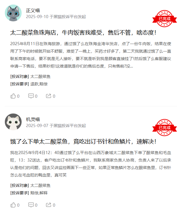 况且太二酸菜鱼此前就曾在食安问题上有过翻车案例,黑猫投诉平台上有关太二酸菜鱼的投诉量有200多条,大多集中在有异物、食材变质等。