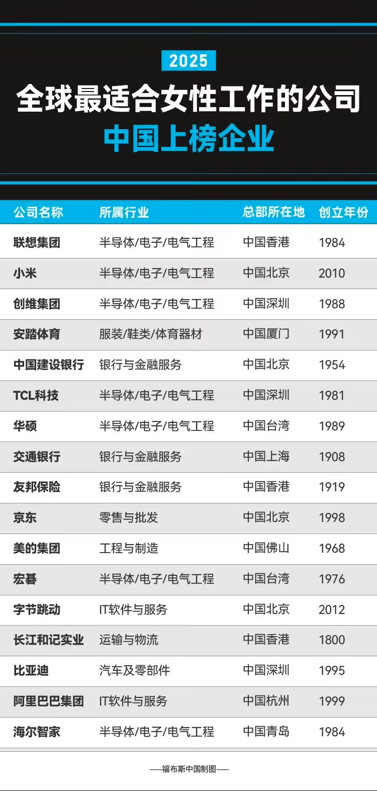 DoNews10月17日消息,《福布斯》联合市场研究公司 Statista 发布了 2025 全球最适合女性工作的公司榜单,这已经是连续第五届榜单。