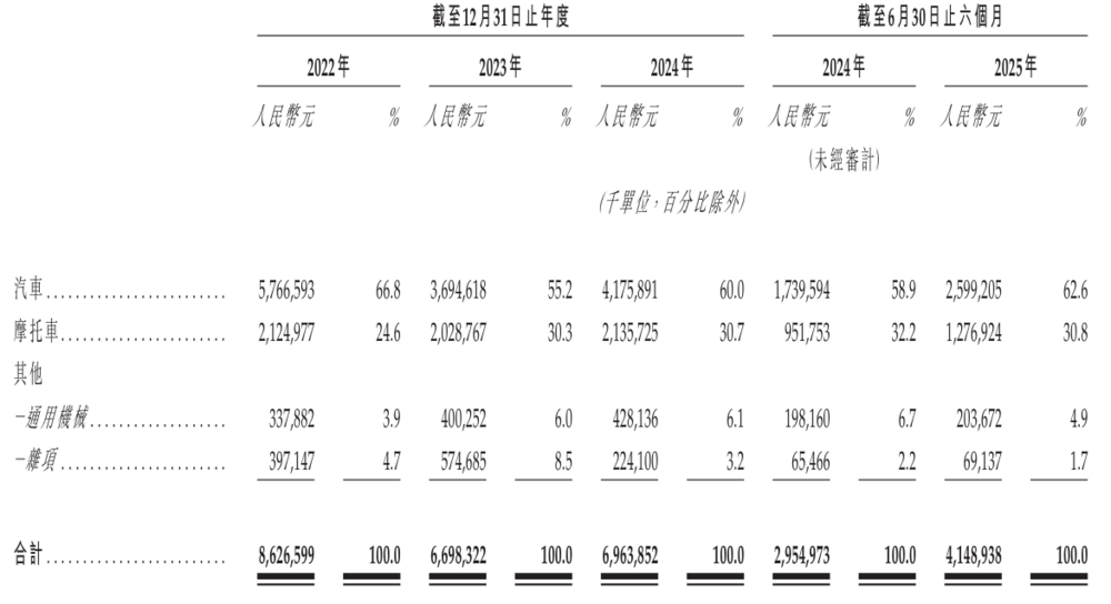 千里科技2025年上半年来自汽车领域的收入为26亿元,占营收的比例为62.6%;来自摩托车的收入为12.77亿元,占营收的比例为30.8%。