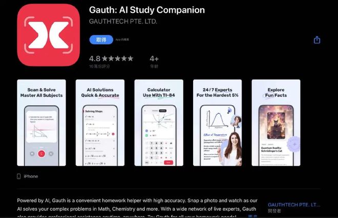 Gauth是字节跳动旗下面向海外市场的一款AI教育产品,上线于2020年12月,海外学生可借助其解题。