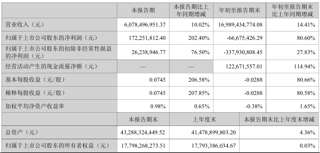 累计来看,公司前三季度营业收入 169.89 亿元,同比增长 14.41%,亏损 6667.54 万元。