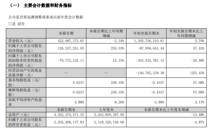 年初至报告期末,营业收入为13.06亿元,同比增长5.79%;归属于上市公司股东的净利润为-0.88亿元。