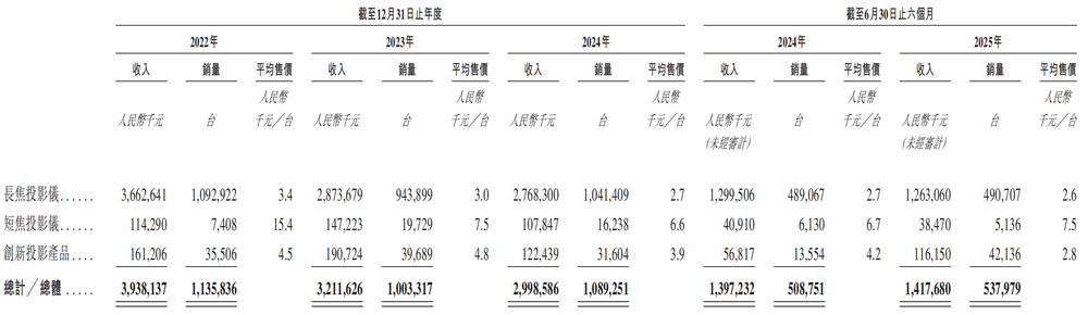 以2025年上半年为例,平均售价为2600元的长焦投影仪收入为12.63亿元,占营收的比例高达77.82%,而平均售价高达7500元的短焦投影仪收入占比仅为2.37%。而在2022年,长焦投影仪和短焦投影仪的平均售价分别为3400元和1.54万元。