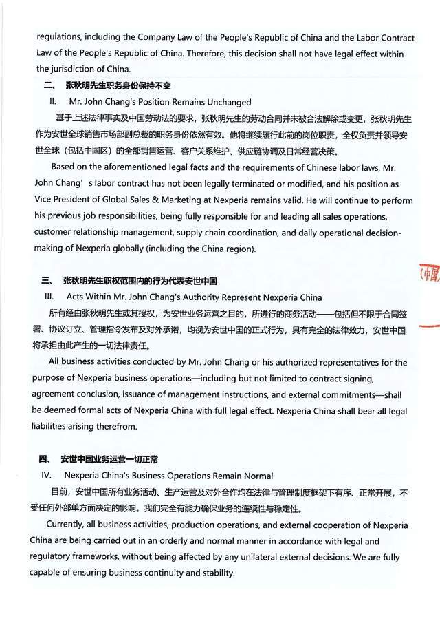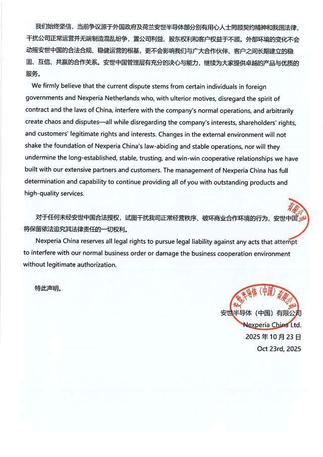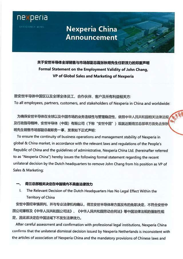 其中提到,为确保安世半导体在全球以及中国市场的业务连续性与管理稳定性,依照中华人民共和国相关法律法规及行政指导精神,安世半导体(中国)有限公司(下称“安世中国”)现就近期荷兰总部单方面免去张秋明先生销售市场部副总裁职务一事,发表如下正式声明:一、荷兰总部相关决定在中国境内不具备法律效力;二、张秋明职务身份保持不变;三、张秋明先生职权范围内的行为代表安世中国;四、安世中国业务运营一切正常,目前,安世中国所有业务活动、生产运营及对外合作均在法律与管理制度框架下有序、正常开展,不受任何外部单方面决定的影响。我们完全有能力确保业务的连续性与稳定性。