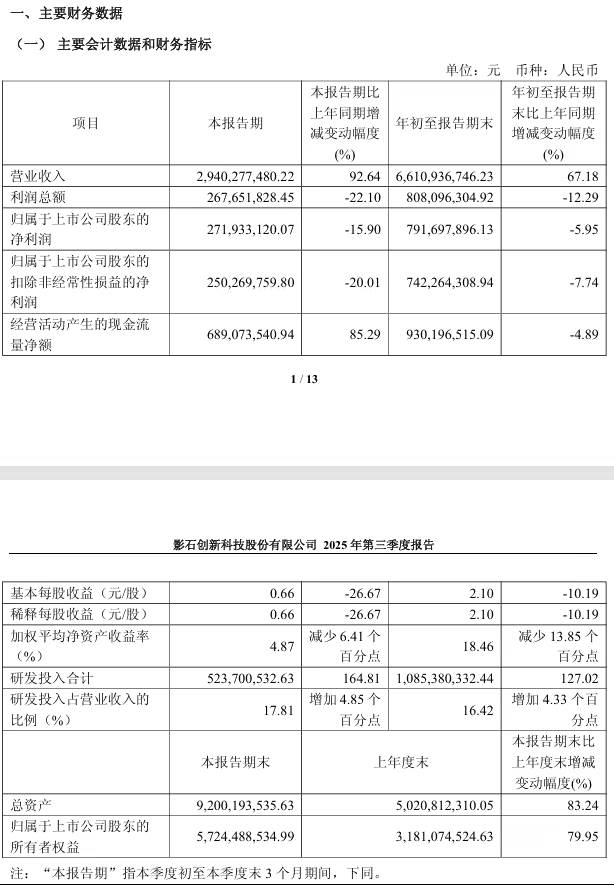 DoNews10月27日消息,影石创新今日公告,2025 年第三季度营收为 29.4 亿元,同比增长 92.64%;净利润为 2.72 亿元,同比下降 15.90%。前三季度营收为 66.11 亿元,同比增长 67.18%;净利润为 7.92 亿元,同比下降 5.95%。