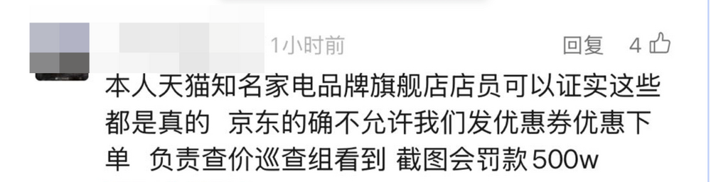 就在这份罚款单被曝出的同时,也有网友在媒体报道京东此次二选一的新闻下发布评论,称“本人可以证实都是真的,京东的确不允许我们发优惠券下单,负责查价巡查组看到,截图就会罚款500万”。