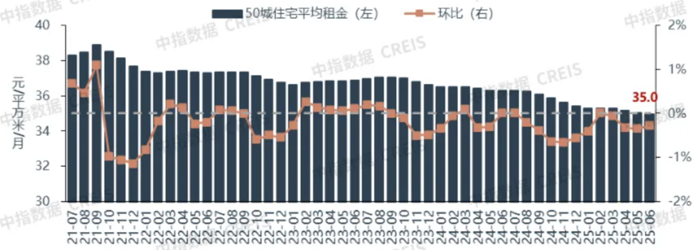 根据中指研究院发布的《2025年上半年中国住房租赁市场总结与展望》,2025上半年重点城市住宅平均租金小幅下行。根据50城住宅租赁价格指数,2025上半年,重点50城住宅平均租金累计下跌1.37%,跌幅较去年同期扩大0.47个百分点。其中,6月50城住宅平均租金为35.0元/平方米/月,环比下跌0.27%,同比下跌3.71%。