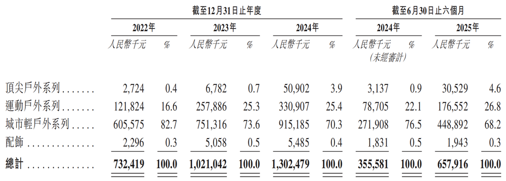 2022年至2024年及2025年上半年,城市轻户外系列收入分别为6.06亿元、7.51亿元、9.15亿元和4.49亿元,占营收的比例分别为82.7%、73.6%、70.3%和68.2%,虽然占比逐年下滑,但仍是主导坦博尔营收的核心力量。相比之下,顶尖户外系列收入占比分别0.4%、0.7%、3.9%和4.6%,反映出顶尖户外系列表现疲软,坦博尔的高端化战略远未达到预期。
