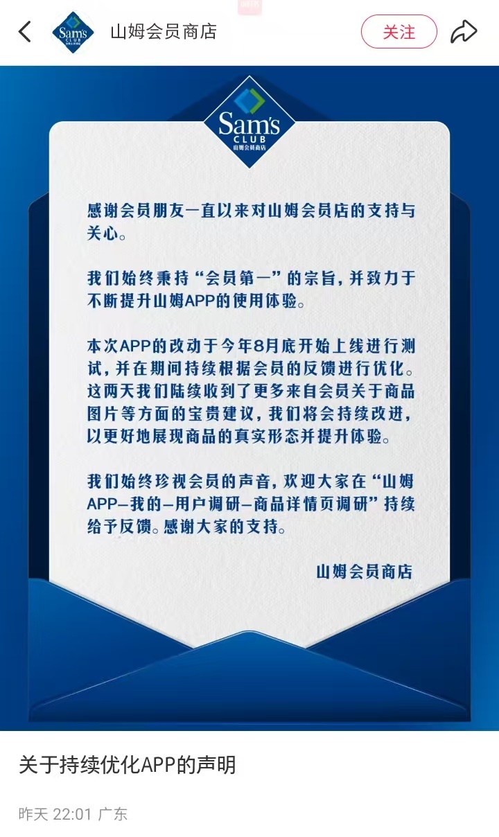 对此,11月3日晚,山姆会员商店在社交平台发布声明:“我们始终秉持‘会员第一’的宗旨,并致力于不断提升山姆APP的使用体验。本次APP的改动于今年8月底开始上线进行测试,并在期间持续根据会员的反馈进行优化。这两天我们陆续收到了更多来自会员关于商品图片等方面的宝贵建议,我们将会持续改进,以更好地展现商品的真实形态并提升体验。我们始终珍视会员的声音,欢迎大家在‘山姆APP-我的-用户调研-商品详情页调研’持续给予反馈。感谢大家的支持。
