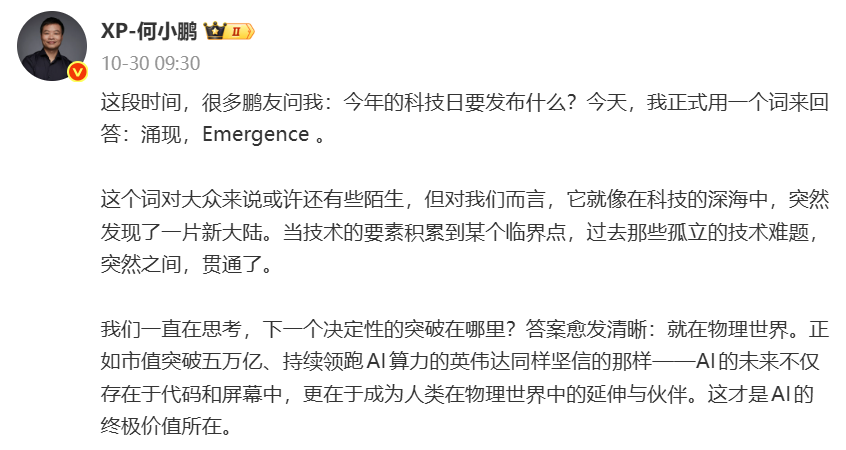据小鹏汽车联合创始人兼 CEO 何小鹏此前预热,2025 小鹏科技日将聚焦“涌现”一词,公司在物理 AI 领域涌现了惊喜的能力,不止一个,而是多个;而且他一直在思考科技的下一个决定性突破,并将物理 AI 誉为“关乎下一个十年”。