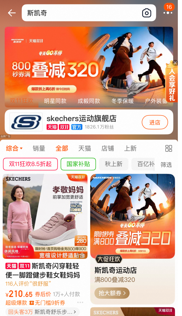 但这几年,斯凯奇在年轻人面前悄悄失宠,在淘宝搜索“斯凯奇”,弹出的第一个广告商品,明明白白告诉你,“孝敬妈妈,送斯凯奇”。