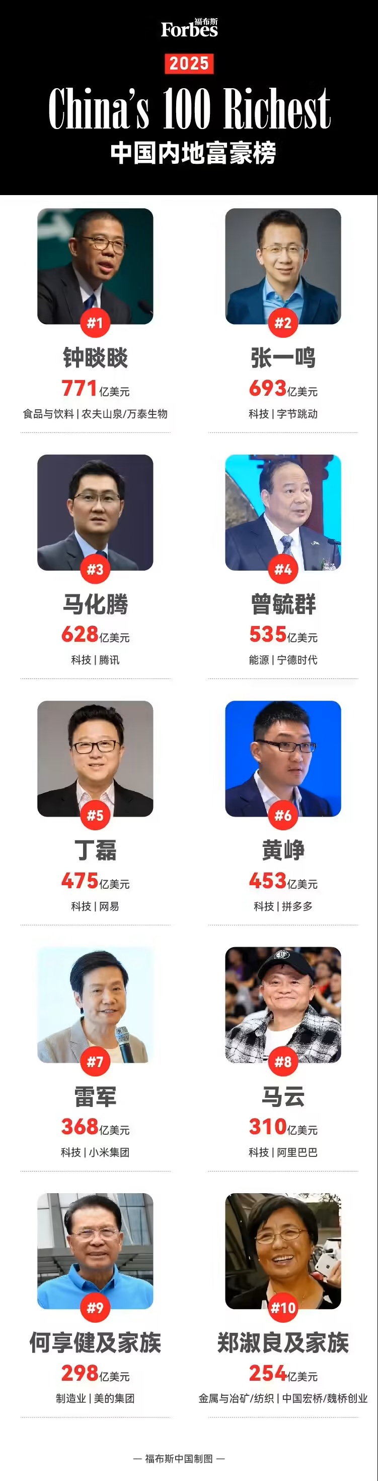 DoNews11月7日消息,2025 福布斯中国内地富豪榜今日正式发布,榜单中三分之二的富豪身家实现增长。