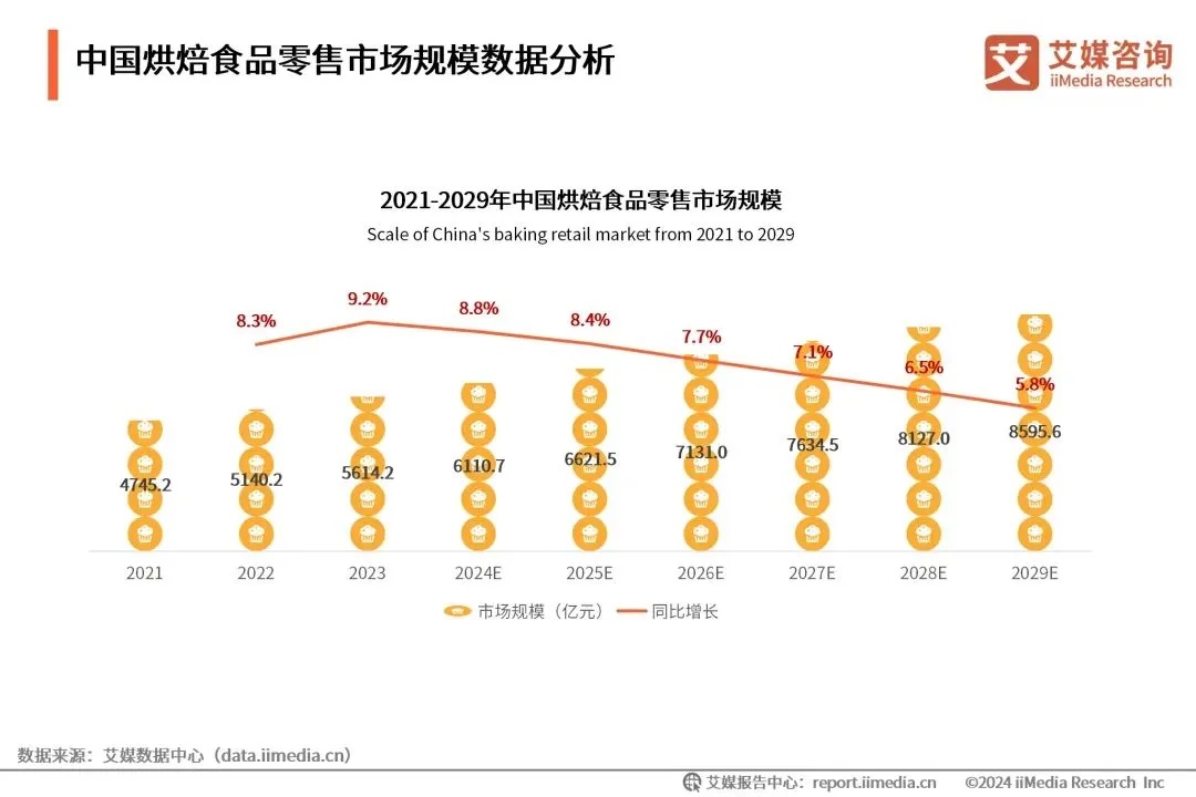 客观来说,目前国内整个烘焙市场仍然有着一定的发展前景。据艾媒咨询所发布的数据显示,2023年我国烘焙食品零售市场规模为5614.2亿,同比增长9.2%;随着消费者对品质烘焙食品的持续追捧,预计到2029年这一市场规模将会达到8595.6亿。