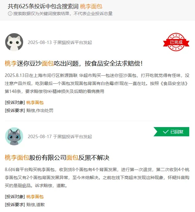 黑猫投诉平台上,目前有关桃李面包的投诉量超过600条,大多数集中在产品过期变质、包装内有异物等。