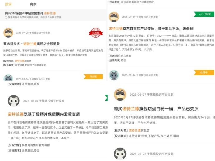 黑猫投诉平台统计显示,关于诺特兰德的投诉量已达310条,其中“成分标注不清导致不良反应”“产品变质”“售后服务差”等问题屡见不鲜。