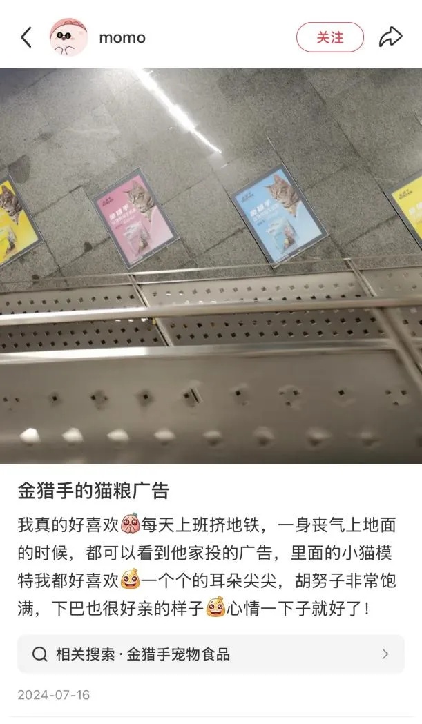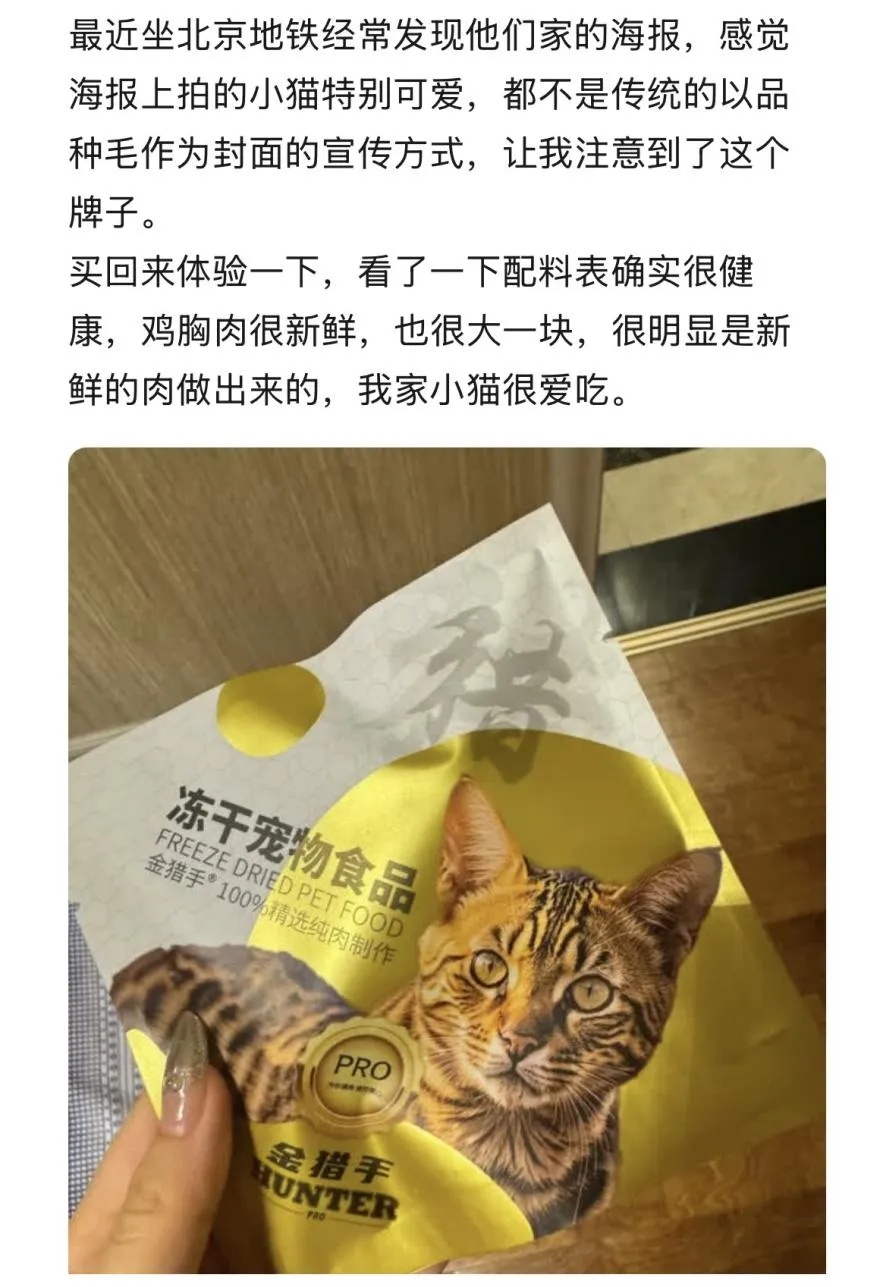 若不是在经常在北京地铁里看到“金猎手”萌萌的猫咪高清图,朵朵很难注意到还有这样一个品牌:从未出现在任何直播间,甚至在小红书也该品牌的带货笔记。