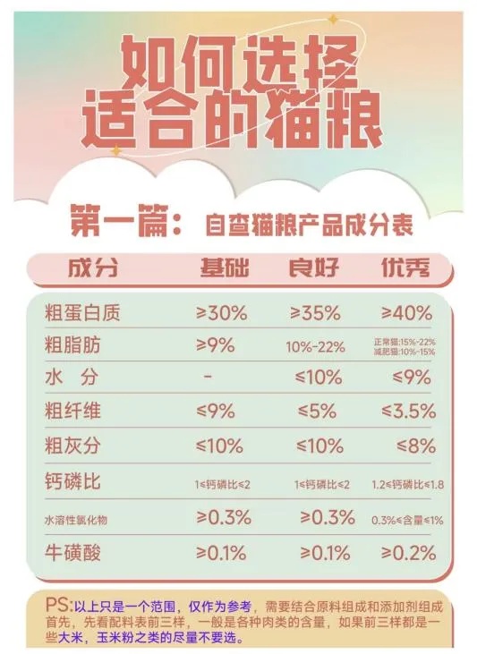 根据网上的众多攻略,选择高品质猫粮主要看以下几点,首先含肉量一定要高,猫作为肉食性动物,淀粉含量高于鲜肉含量的猫粮品牌往往在第一道关卡就被pass了,因为无谷物配方的猫粮,更有助于猫咪肠道消化吸收。其次粗蛋白含量含量也被纳入考核指标之一,成猫和幼猫都有不同的标准,但是最低也要求要30%的粗蛋白含量。