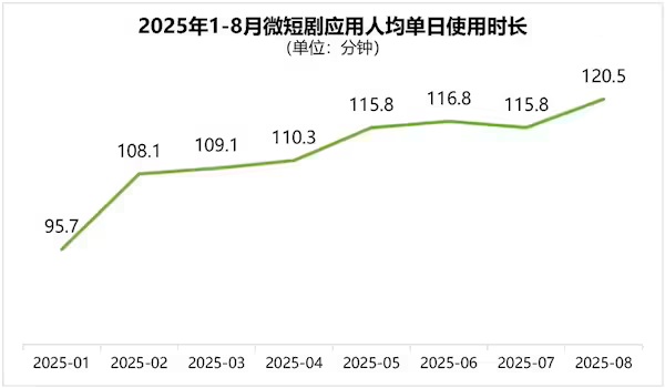 2025 年 1-8 月,微短剧应用的人均单日使用时长达到 120.5 分钟,较 1 月增幅达 25.9%。白皮书中的调研发现,近八成用户观看频率较去年提升,48.5% 用户“每天必看”。